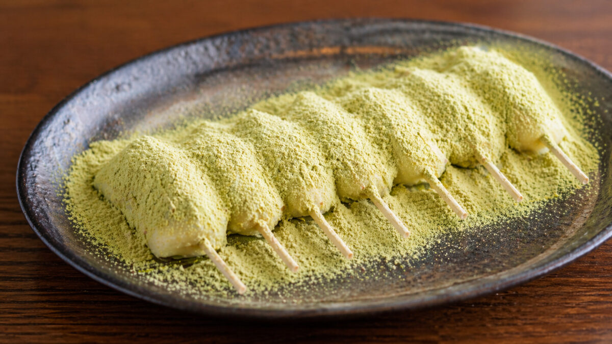 三井寺力餅は、滋賀県大津市の老舗「三井寺力餅本家」が製造・販売する大津名物の和菓子です。串に刺した小さな餅に、独自の蜜を塗り、青大豆と抹茶をブレンドしたオリジナルの青いきな粉をたっぷりまぶした素朴で上品な味わいが特徴です。