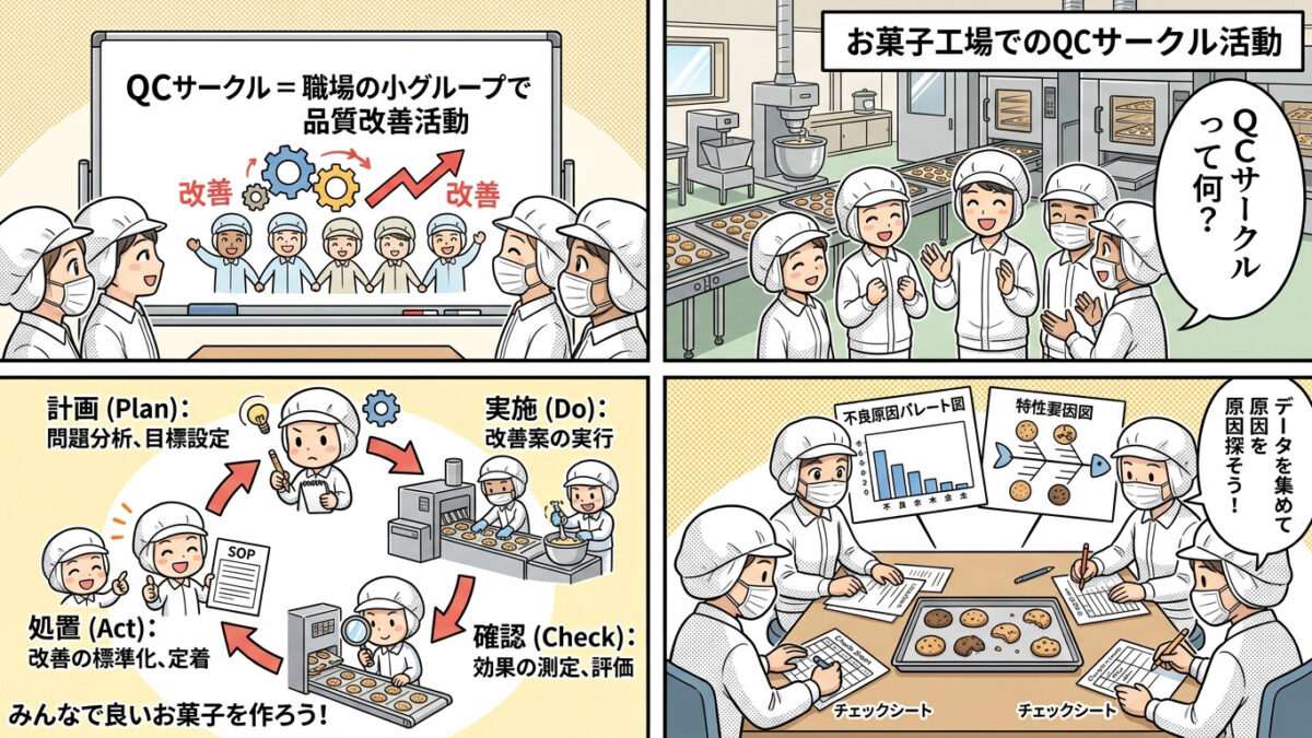 お菓子作りでは、味や食感、見た目の均一性が商品価値を決めるため、QCサークルを通じて現場の声が製品の信頼性向上に直結します。近年も食品工場でこの活動が続けられており、品質だけでなく働きやすい環境づくりにも寄与しています。